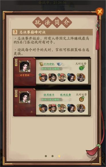 2.进入8强总决赛后,将不会隐藏小组内其他掌柜的信息,但所有掌柜都将默认上阵最强的5名门客迎战所有对手,掌柜也可根据自己的策略任意调整迎战每个掌柜时的小队天时。