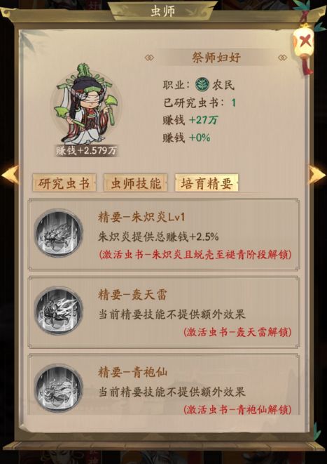 激活对应虫书且蜕壳达到指定阶段后,可解锁促织对应的培育精要技能。六星促织的精要技能可激活技能效果,提升促织通过虫书和虫师技能获得的总赚钱。