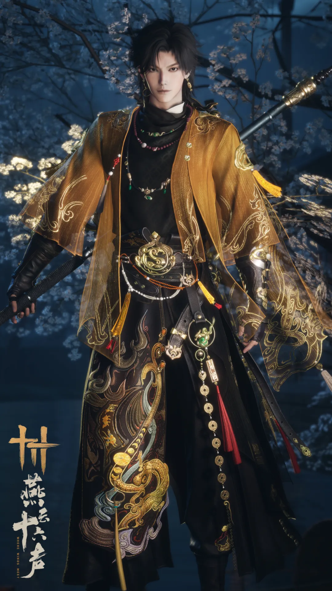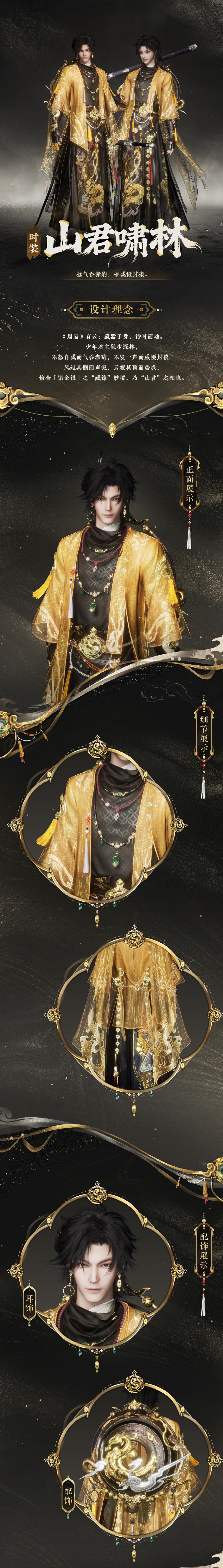 衣袍虽承主人华贵之气,但剪裁流畅利落,贴合朝气挺拔之姿。又撷西汉海昏侯墓漆樽所载万象,龙腾云涌、日月交辉之间,锋芒不显却威仪堂堂。仿佛这天地寰宇,也不过是其爪下又一片更广袤的猎场。