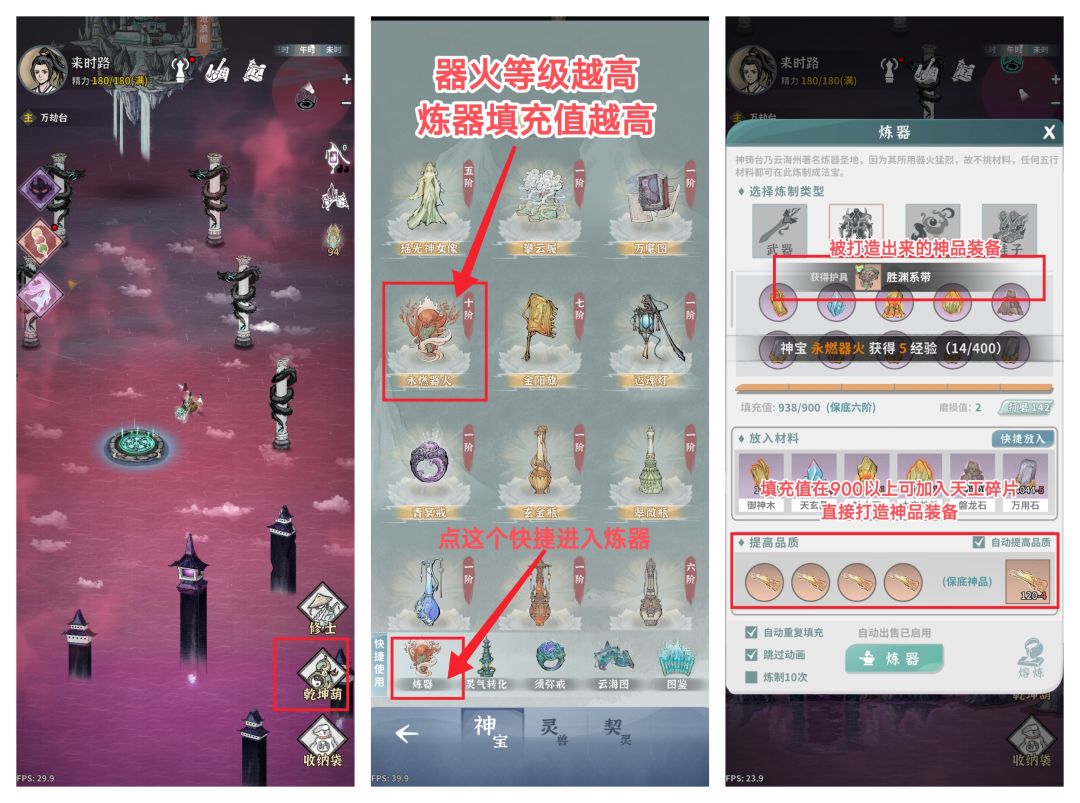 如图所示炼器有概率直接掉落神品装备,有极低的概率会直接出现我们需要的特殊词条