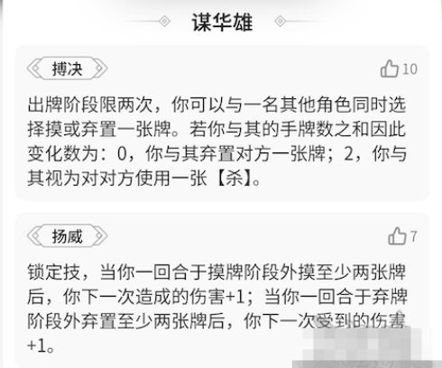 谋华雄排位强度很高,源于其六血的厚身板,搏决能多刀摸牌,摸牌能加伤的机制。所以排位里面配合还是很多的。