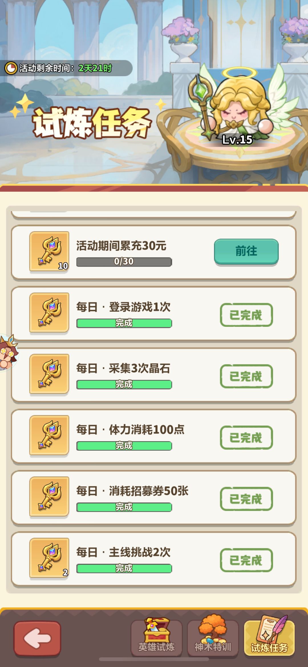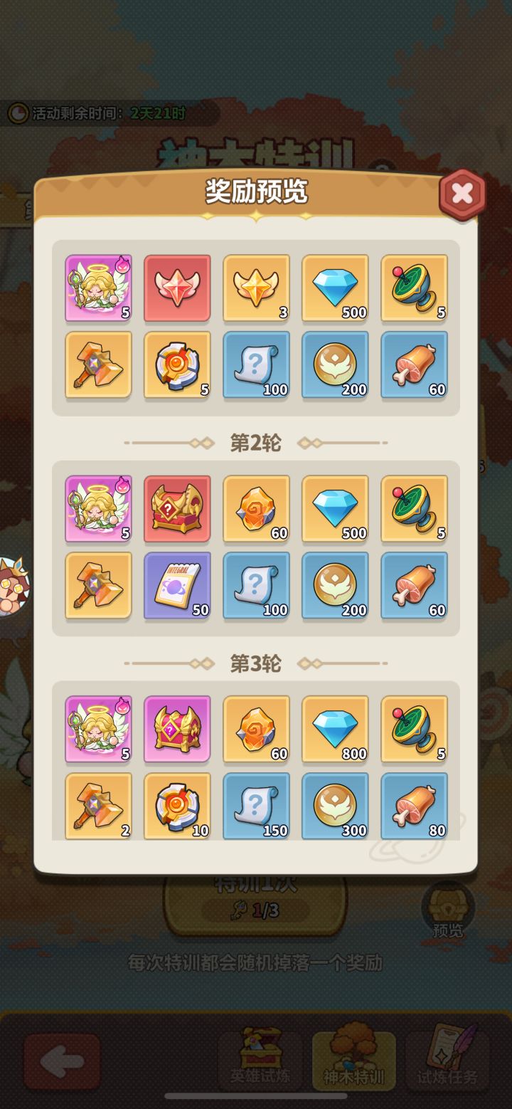 新活动采用“神木特训”式玩法,核心为消耗钻石购买特训券参与抽奖,共分三轮,需拿完当前轮次所有奖励才能解锁下一轮。奖励获取途径分为两类:一是通过完成每日任务白嫖特训券,足以覆盖大部分第一轮奖励;二是消耗钻石购买特训券冲刺后续轮次,每轮均有专属核心奖励。