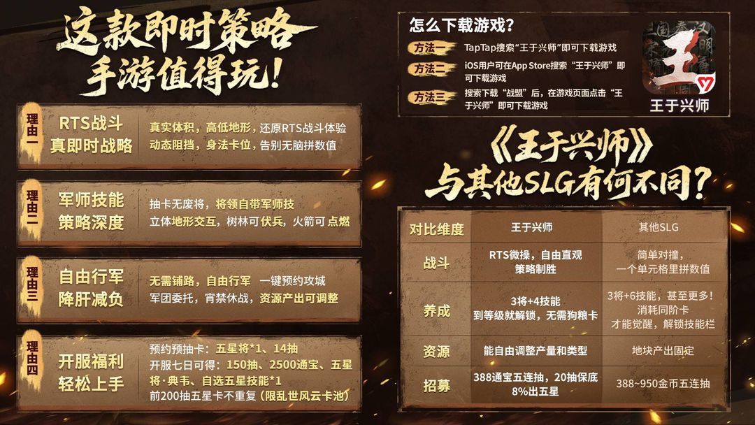 即时沙盘战略手游《王于兴师》已正式上线!真实立体地形设计,带来多变战略;微操每支队伍,每场战斗都充满智慧与策略的较量。立即加入真实自由、策略至上的沙盒战场,体验全新RTS+SLG!