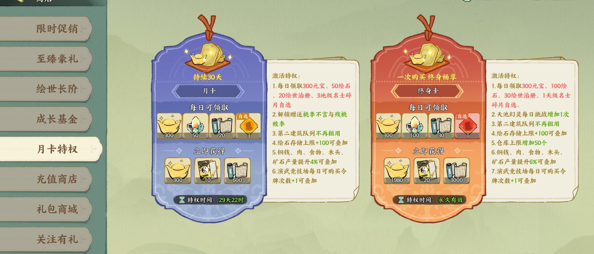 之前一直认为这两个卡不是很值,但现在看来,无论是产量加成,还是每日奖励,都是比较可观的,更关键的是更新增加了双卡收益,多给很多名士碎片,现在就比较值了。