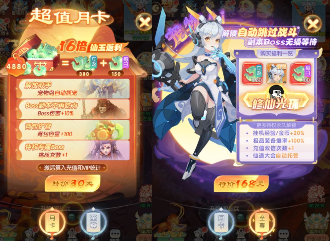 这个游戏想要玩轻松愉快。30元月卡的也是非常必要,可以解放双手解锁自动抓宠,到达svip1后一键扫荡副本。如果预算充足更建议早点买168元至尊卡,解锁自动跳过战斗,节省很多时间,早买早享受;另外还有经验/金币+20%的特权BUFF加成。