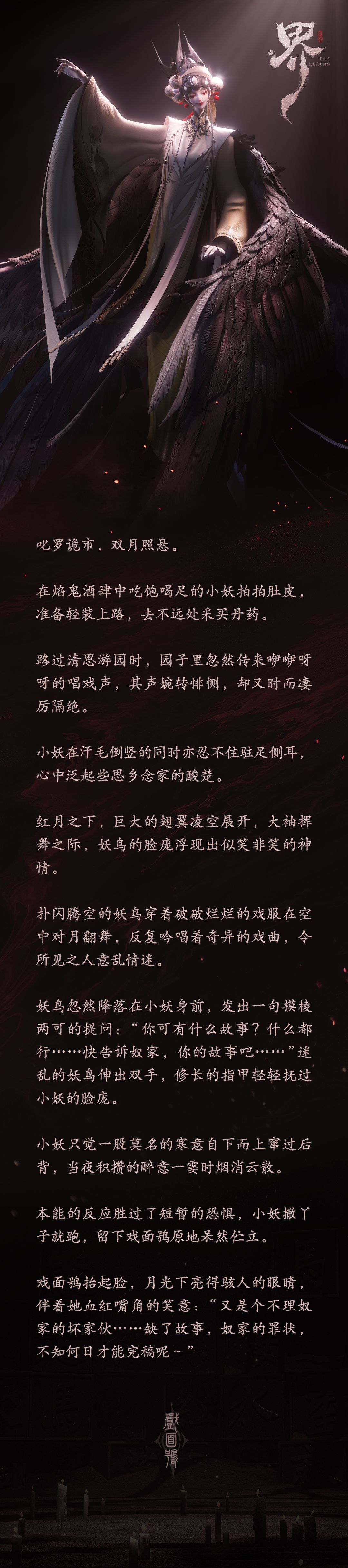 诡市深处,清思游园,传闻住着这么一位鬼妖皆知的精怪,名唤戏面鸮。人面鸟身,翅翼凌空,似笑非笑,缠人心魄。世间万物她皆不放在眼中,唯对鲜活的故事情有独钟。