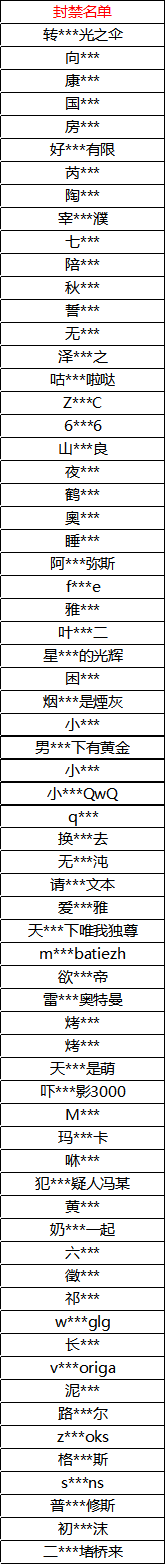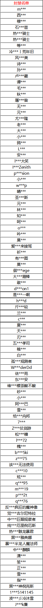 感谢大家一直以来的支持!自游戏上线以来,团队收到了有关部分玩家使用外挂的举报消息,有个别守护者非法使用第三方工具进行游戏,破坏了游戏规则和生态。《坎公骑冠剑》运营团队一直致力于打造绿色公平的游戏环境,我们对此高度重视。最近1个月采取【封禁】处理的帐号ID名单公示如下图所示。