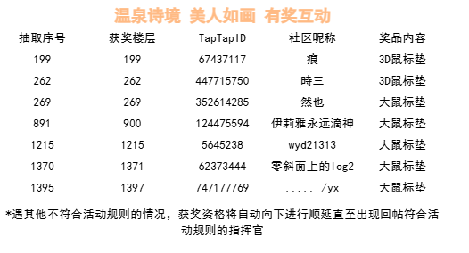 请获奖指挥官在12月10日18:00之前联系客服 QQ:800104033,并提供:“TapTap温泉诗境活动中奖账号的后台截图”,以便为您登记与核实邮寄信息。