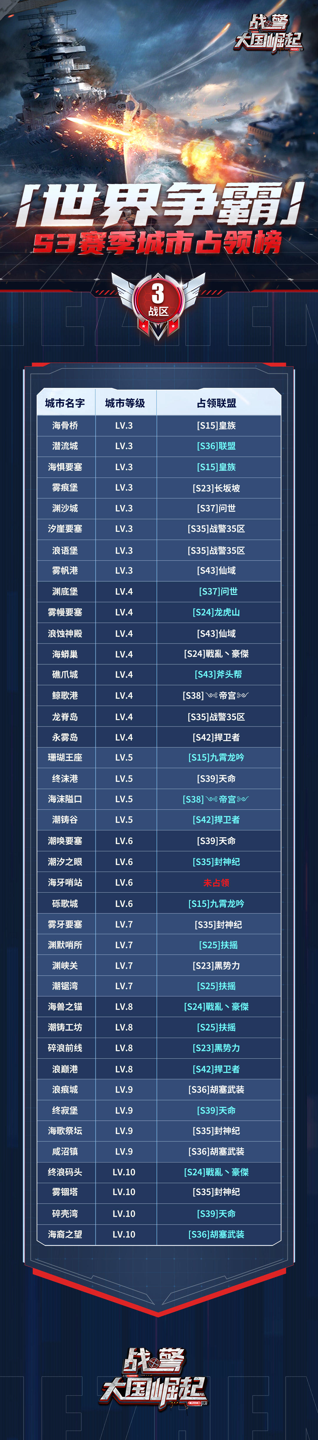 【海上速报】S3 赛季第六周世界争霸城市占领榜