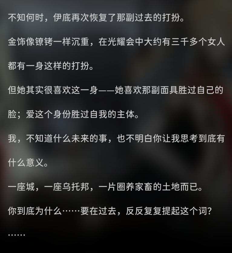 隐隐能感觉伊底有自毁倾向,她厌恶自己的家族包括戴着面具生活的自己。