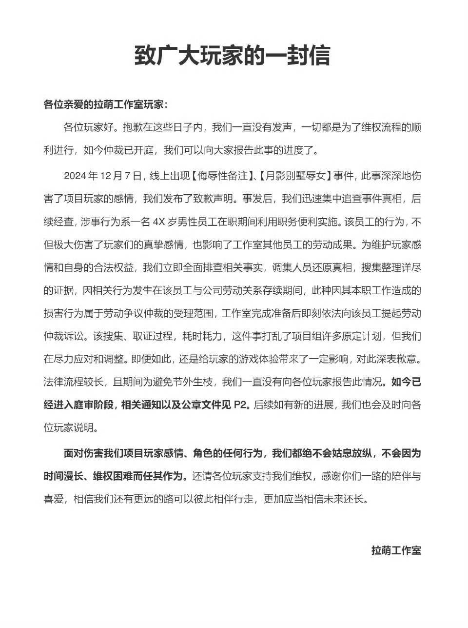 事情的起因是版本数据迁移后,玩家发现部分男主和女性NPC的备注带有侮辱性词汇,官方立刻就发布了致歉声明,还对玩家进行了补偿。之后经过排查,确定是一位40多岁的在职男员工利用职务之便设置的,为了维权,工作室做了不少取证和排查工作,这个过程也打乱了原本的项目计划,仲裁直到现在才进入庭审阶段。