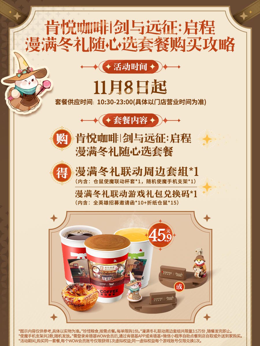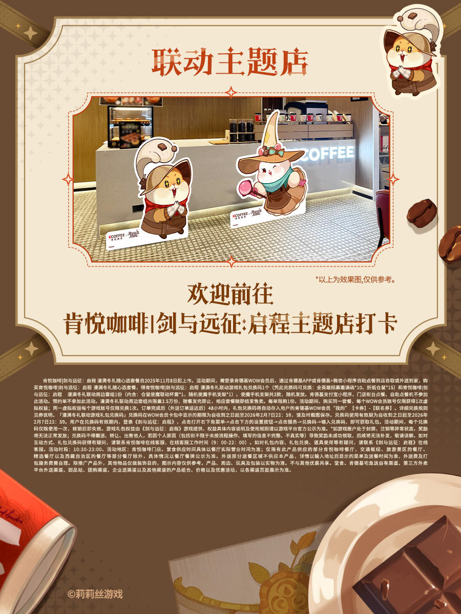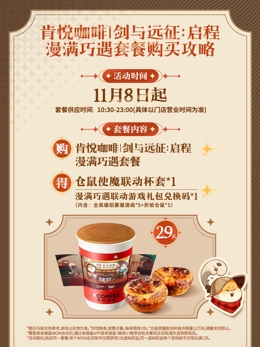 剑与远征启程 x 肯悦咖啡联动将于明日开启!11月8日起,联动套餐、周边、联名线下主题店等多种惊喜即将上线,快来肯悦咖啡工坊品尝满满做的冬日热饮哦~
