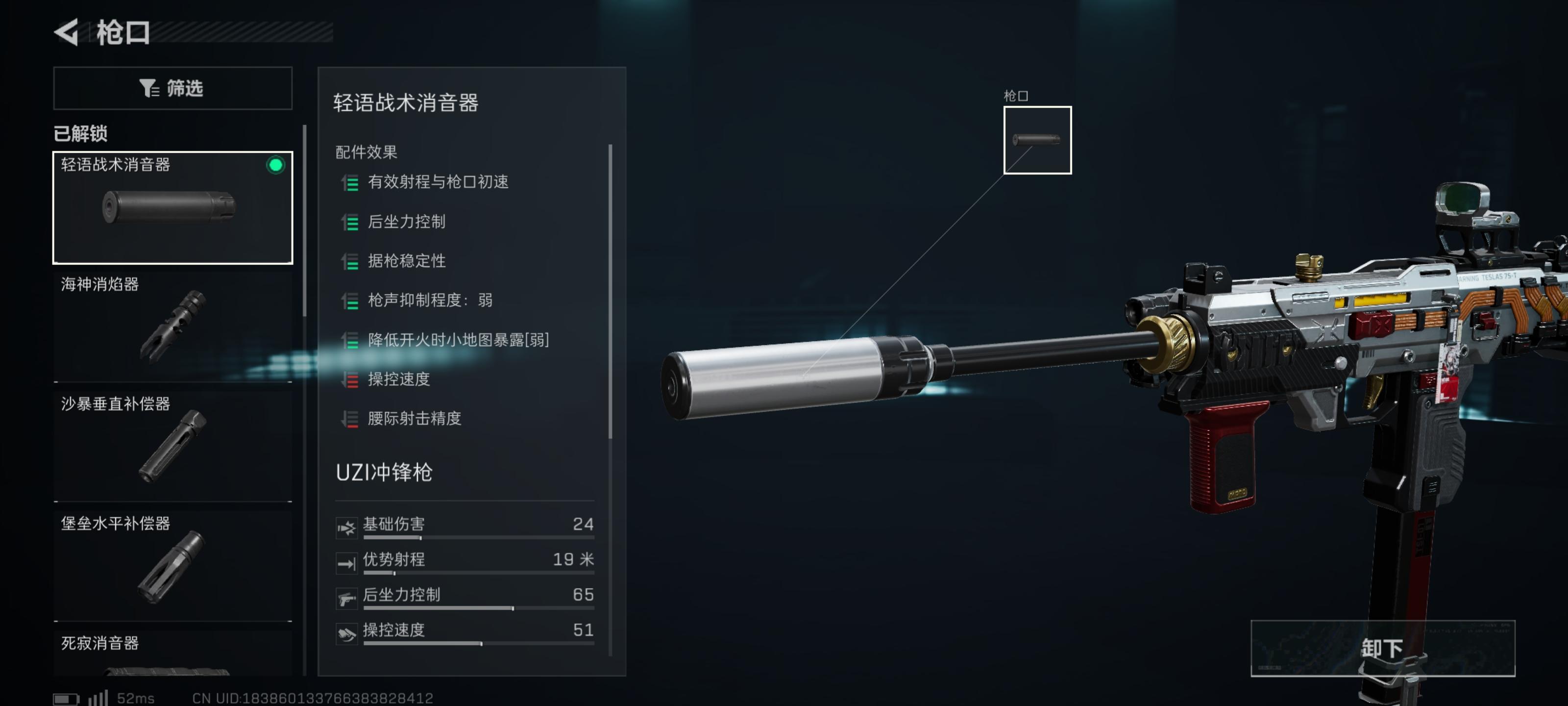 枪口我选择轻语战术消音器。这个消音器可以提升UZI的射程以外,另外还有高额的后坐力控制以及据枪稳定性。