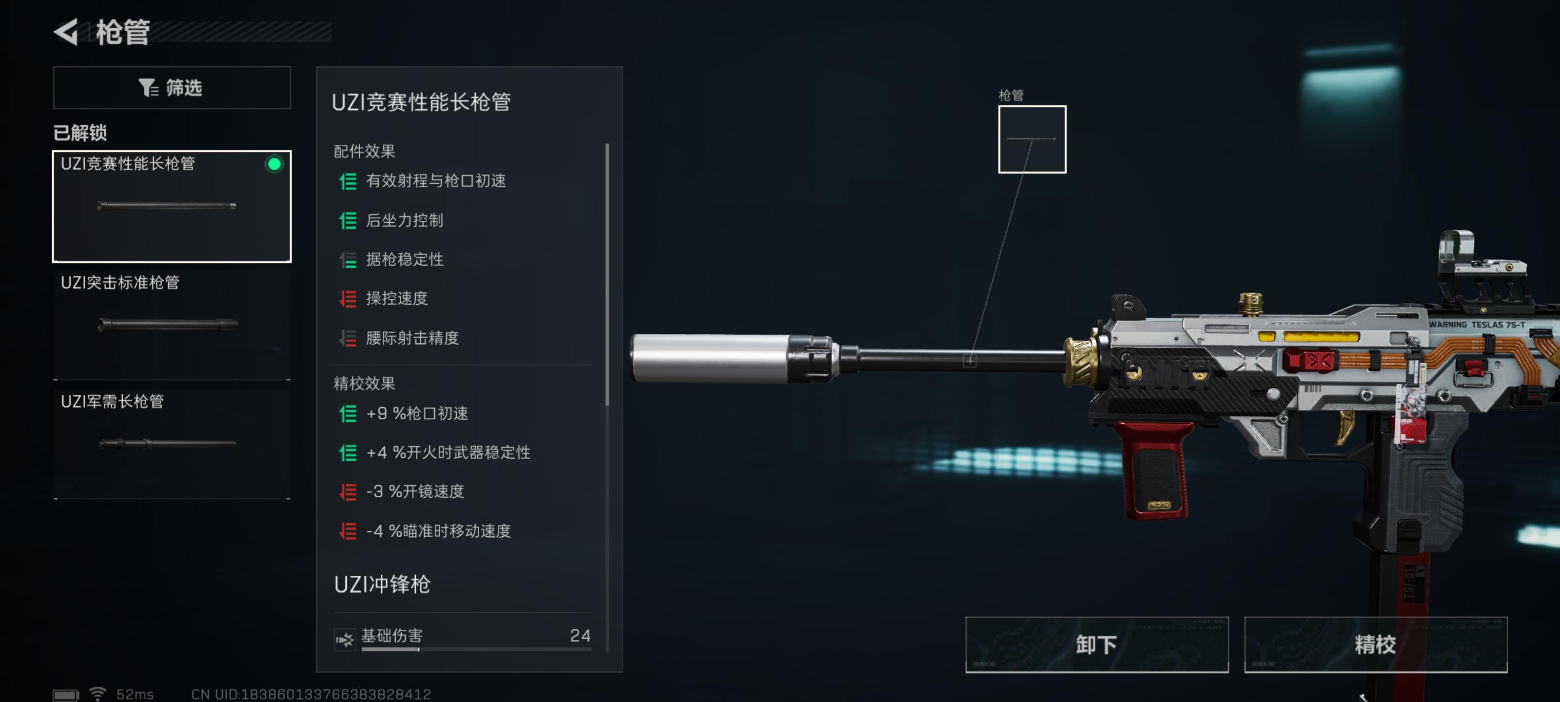 枪管选择UZI竞赛新性长枪管。这个配件和枪口共同搭配,能使UZI的优势射程提升到了十九米,并且再一次提升枪械的稳定性。对于枪口和枪管带来的大额负面操控速度,在操控速度六十八的UZI面前不值得一提。