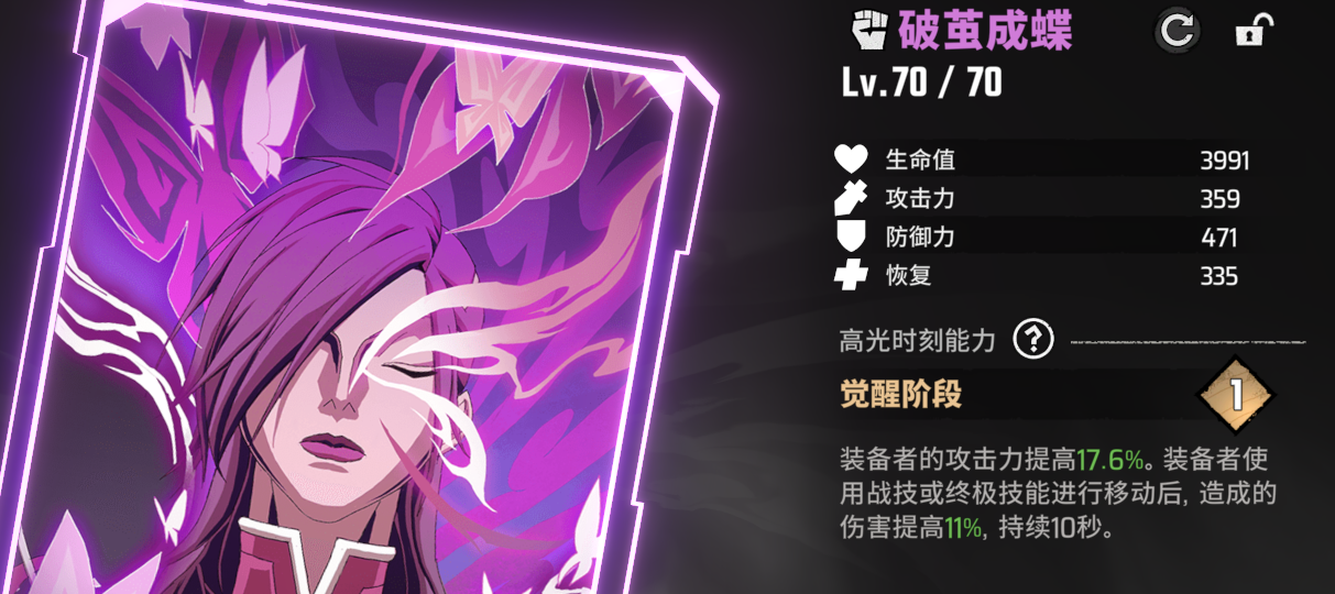 灵蝶是可以靠闪避机制充当前排的,但大招刮痧属实难绷,需要靠后续普攻一点点引爆印记补伤害,算是追击系里爆发最低的英雄。好在夜幕商店送碎片,高花数尚可一战,不过专武是真强,一般都拿去先给雷神用了。