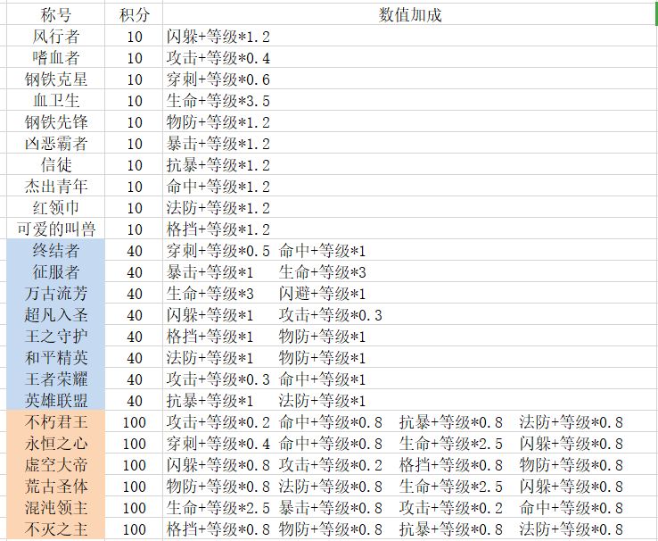 (2). 以10积分称号的数值加成为基准,并且10称号的综合评分是一致的,为了换算方便 将生命的数值加成变成等级*3.6(提高0.1加成)