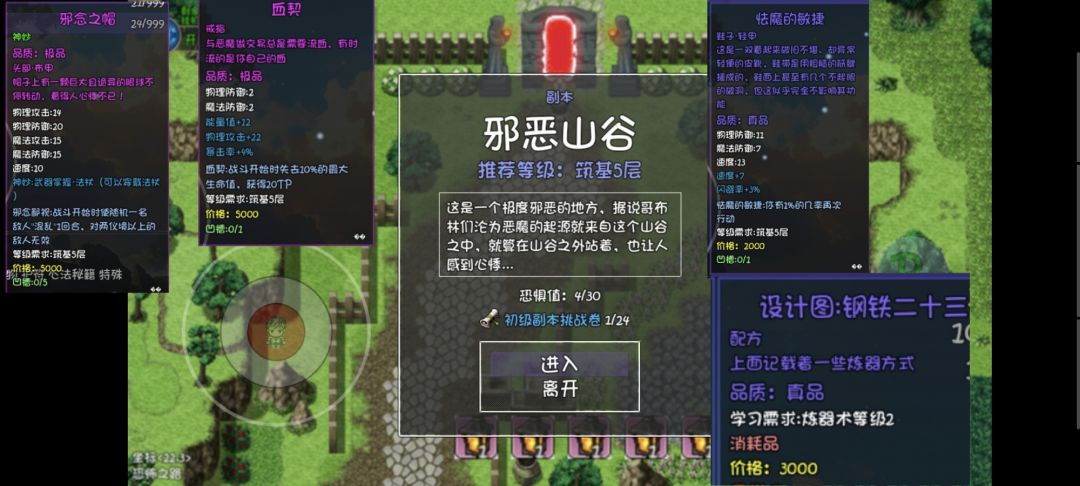 19.解锁邪恶山谷副本就开始刷副本,刷到血契、邪念之帽、怯魔的敏捷都可以留一下,刷到钢铁二十三图纸就可以先停止刷副本了(做这个装备的原因是目前全员大部分装备都是破烂,钢铁二十三有175的伤害抵抗和40双抗,做出来后打筑基强者可以多抗一轮,而且材料易获取)。