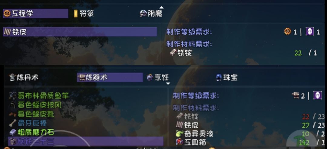 20.去货栈镇工程师处购买铁皮配方,如果锻造材料不足就去刷怪或者出售背包里的初级材料袋。炼器术等级未达到2级时是无法查看制作钢铁二十三的,目前刷锻造等级最快的方式就是制作星织长袍(月辉林地小怪掉落),如果背包有250个劣质的石头也可以做粗质磨刀石刷熟练度。条件均达成后制作3件钢铁二十三给小明、王烈、里德装备。