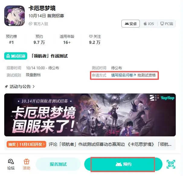 ◆预约《卡厄思梦境》 +评论本贴,抽取五位领航者送出本次测试资格,11月18日开奖。