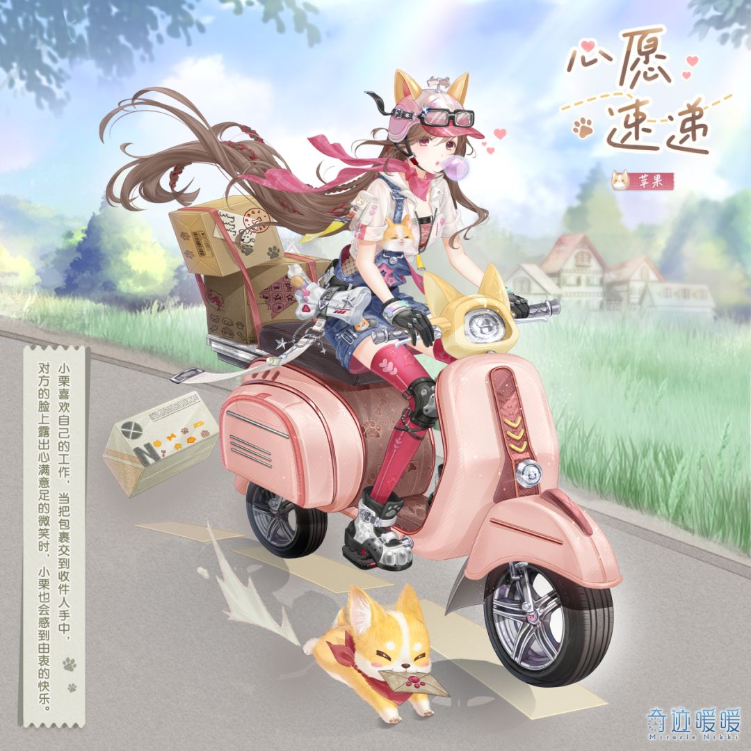 【心愿速递】含正常姿势与特殊姿势,精美面饰“粉红泡泡糖”,精美可移动摆件“飞驰小狗”、“迅风座驾”、“斑驳光阴”。海报展示妆容为“桃心之吻”。