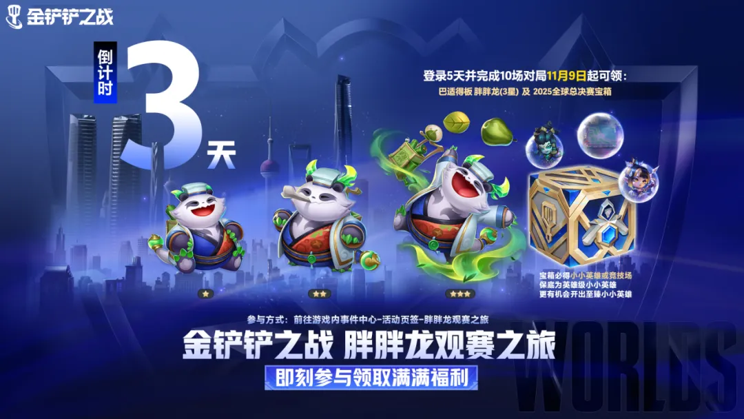 还有3天!金铲铲之战胖胖龙观赛之旅马上迎来最后一站——成都2025英雄联盟全球总决赛冠亚军决赛!