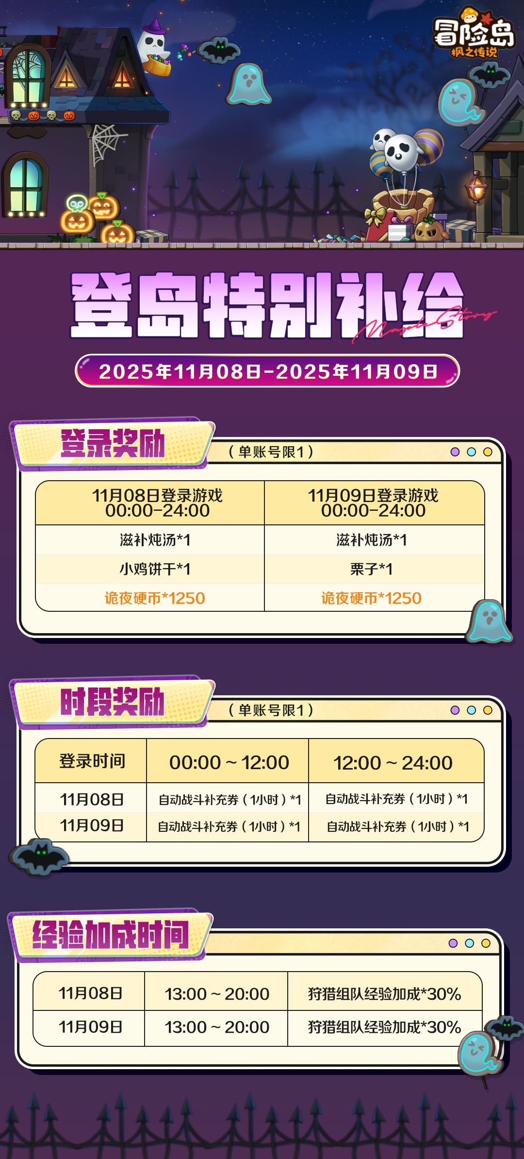 11月9日 00:00~24:00 登录游戏:滋补炖汤*1、栗子*1、诡夜硬币*1250