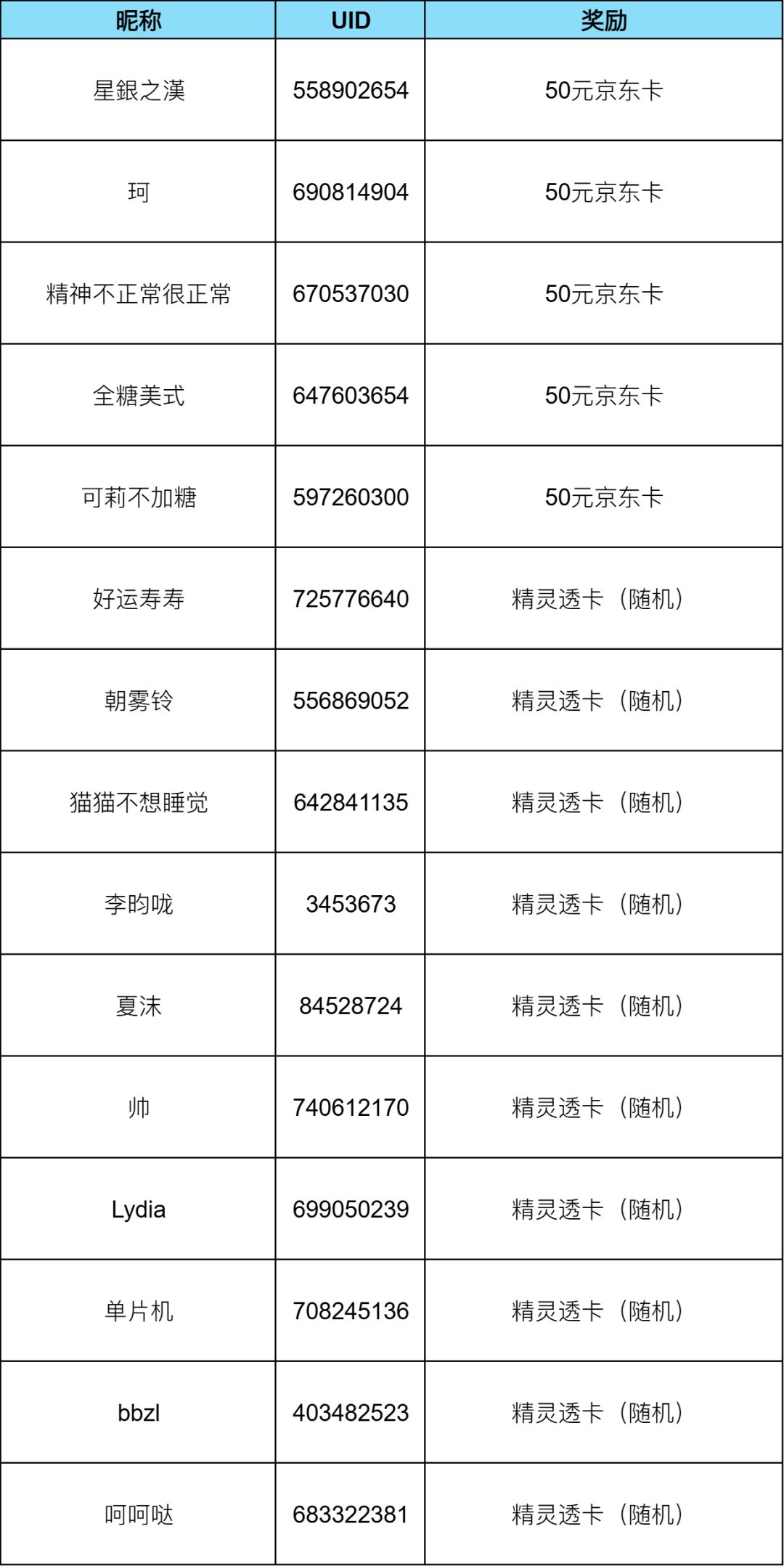 幸运搭子奖(10位):精灵透卡(随机)