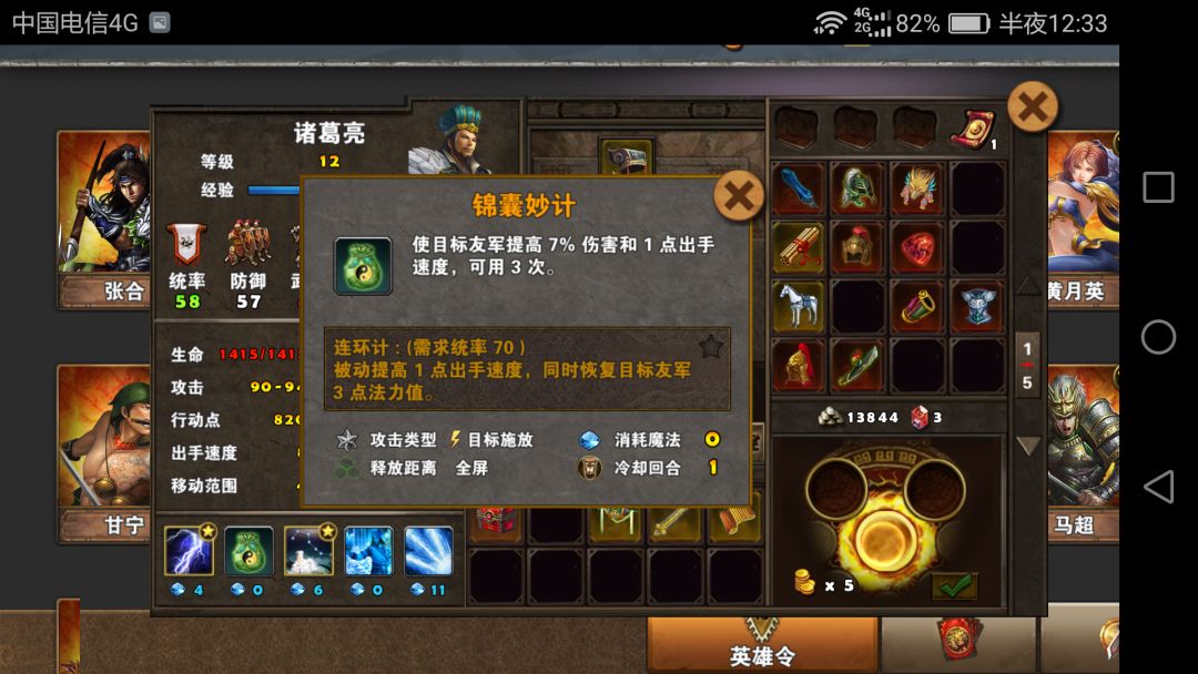 锦囊妙计,3次每次提高7%伤害1手速,70统帅点亮加1被动手速,使用后加3蓝。爱玩竞技的同学都知道手速的重要性,尤其是这关,打金乌,打黄月英,都靠那第一回合的主被动加手速才能先发制人。