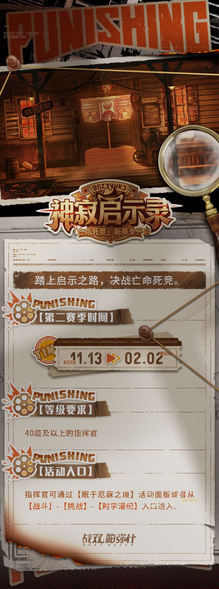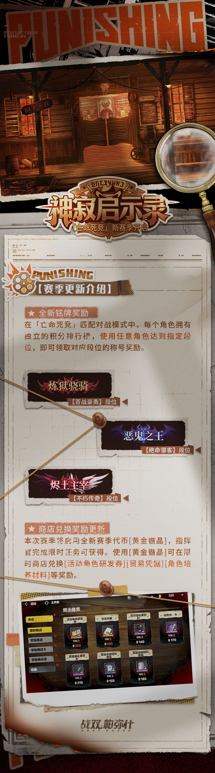 本次「亡命死竞」模式新增饰品系统、符纹效果更新、段位铭牌奖励等内容;此外,完成限时任务可获得新赛季代币[黄金镞晶],使用[黄金镞晶]可在限时商店兑换[活动角色研发券][贸易凭据][角色培养材料]等奖励。