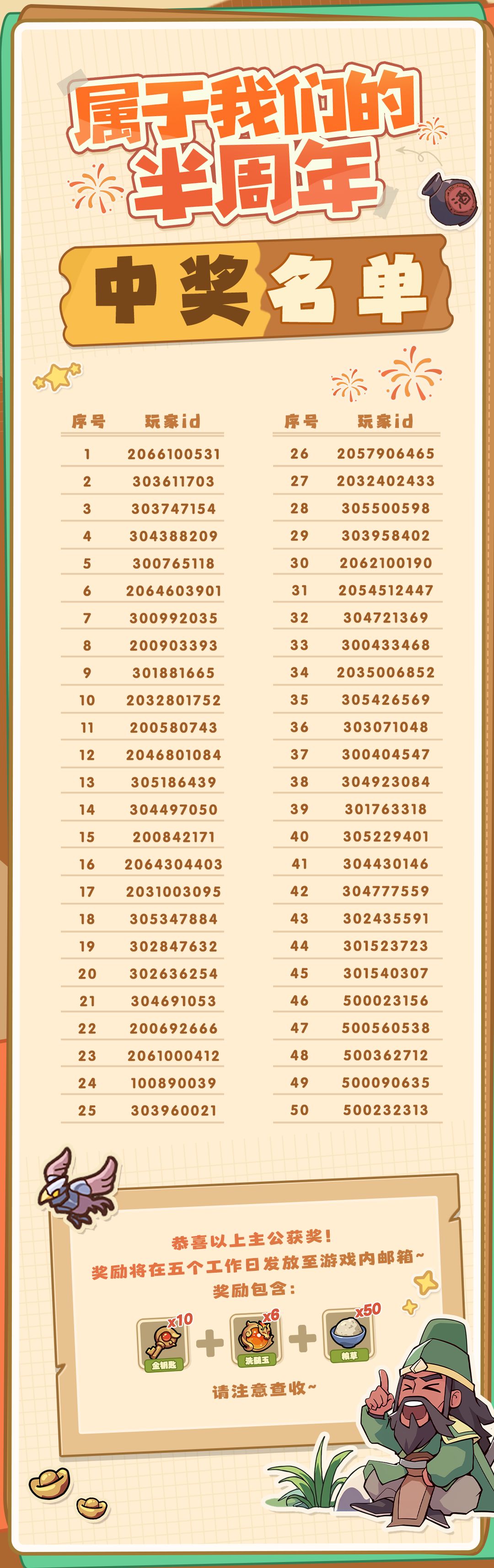 【中奖公示】恭喜以下中奖主公,请于近期留意查收游戏内邮件~