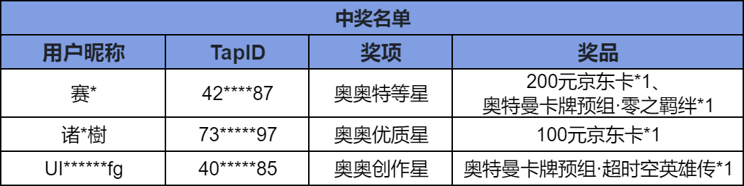 获奖名单已公示,恭喜以下玩家获奖: