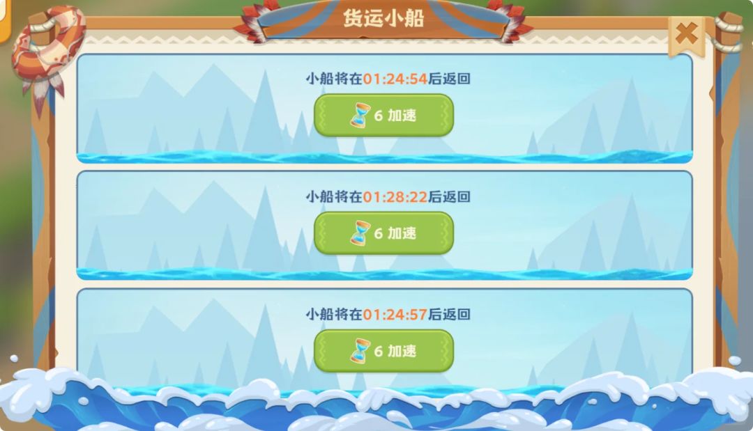 5.图七,超级重要的轮船资源,给钥匙+各种扩地修建筑的钉锤铲道具,建议能生产的一切材料每种留3个用来给每波三条船一口气送走,而不是船来了才现场造,会导致时间分散,影响效率的同时,资源变相减少不说,还要来来回回定闹钟,本来一个闹钟就可以三条船,现在要三个闹钟了,所以一定要提前准备好各类资源。