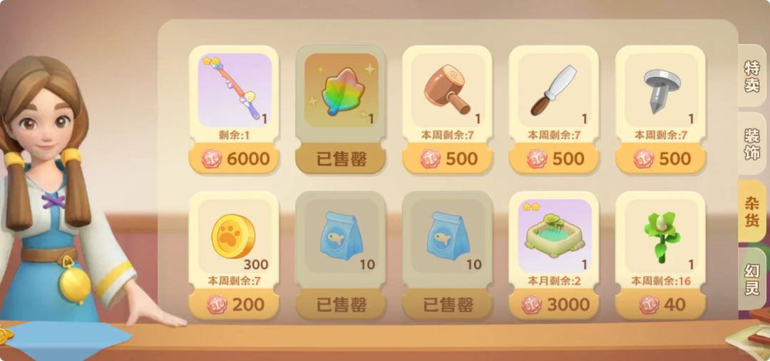 7.图一图九图十图十一,杂货店需要购买的内容为:特卖区清空与订单相关且需要时间制作的材料(种植小麦甘蔗不算,具体原理翻阅第二篇第一篇),杂货区鱼饵玲珑,幻灵区头像,在满足以上要求后,可以额外购买建筑增加繁荣度。