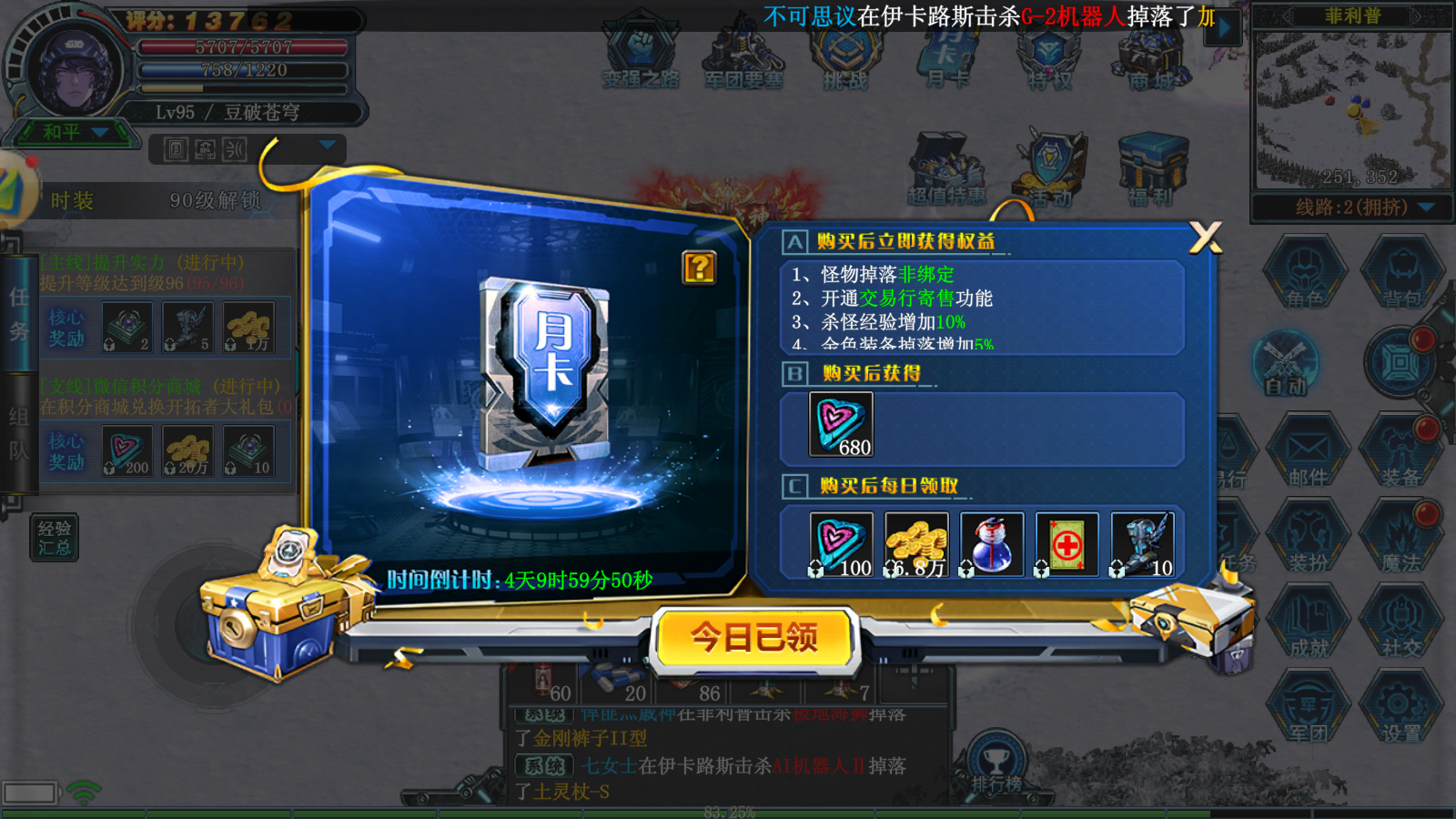 - 每日领取:绑定晶石100 + 决战币5 万 + 灵魂卡片(复活道具)2 + 小飞鞋10