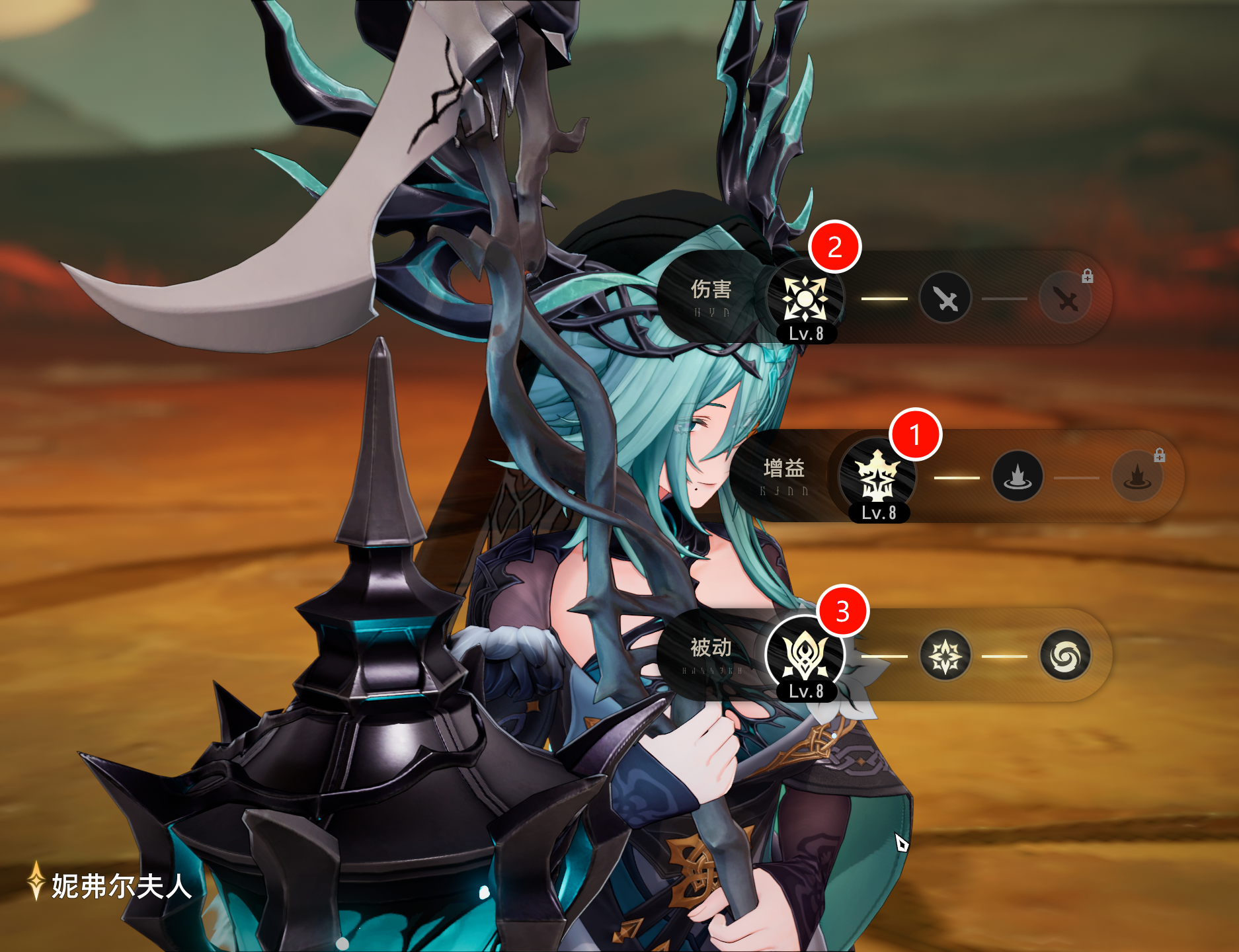 在《二重螺旋》中,妮弗尔夫人是兼具光暗双属性输出与群体控场能力的核心角色,其独特的技能循环与状态管理机制使其在中高练度下表现极为突出: