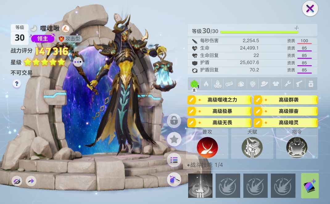 不需要再担心抓到的啾啾属性不好了!无需赌脸刷数值,固定数值的强大领主噬魂啾助你在各个星球无往不利!(该图为满星固定资质满级的属性评分预览,奖池内抽到的为初始星级)