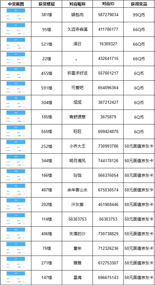 活动截至时有效楼层为2-611楼,经随机数抽取获取获奖楼层和名单如下:
