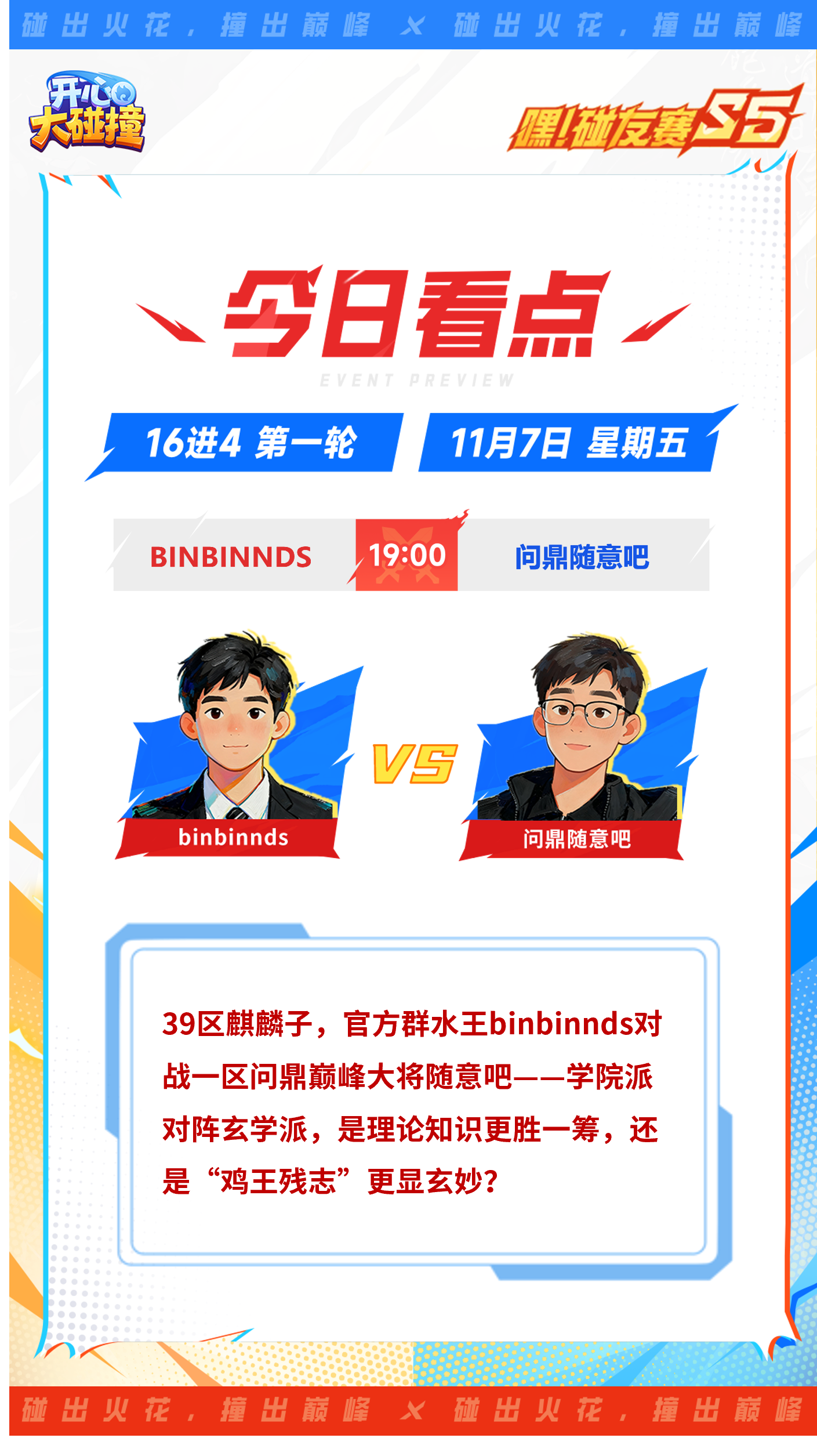 历经半个月的激烈角逐,【嘿!碰友赛S5】终于迎来最激动人心的时刻——总决赛今日正式开打!11月7日至9日,连续三晚,从256名强者中脱颖而出的16位顶尖选手将向冠军宝座发起最终冲击。今晚,冠军之路的火炬已经点燃,谁能剑指最终荣耀,谁又将遗憾止步?让我们共同见证!