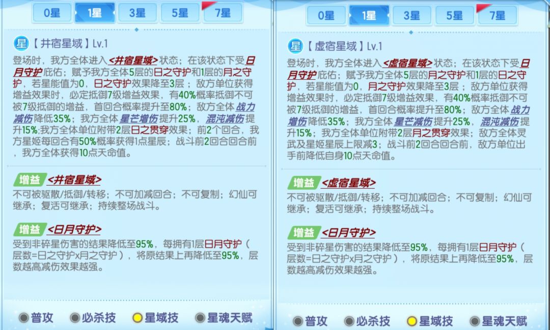 日月守护可以使我方受到非碎星伤害的伤害结果减少5%,每层日月守护则额外减伤1次,实际的减伤比例是1-95%^(1+日之守护*月之守护),下表展示了星域技各星级时日月守护的减伤比例,这个减伤在伤害计算中是独立乘区。