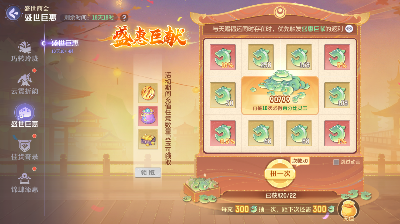 活动期间,购买打折礼包有几率触发免单,返还全额绑玉!买得越多,免单几率越大!更有灵玉抵扣券加码,优惠叠上叠!