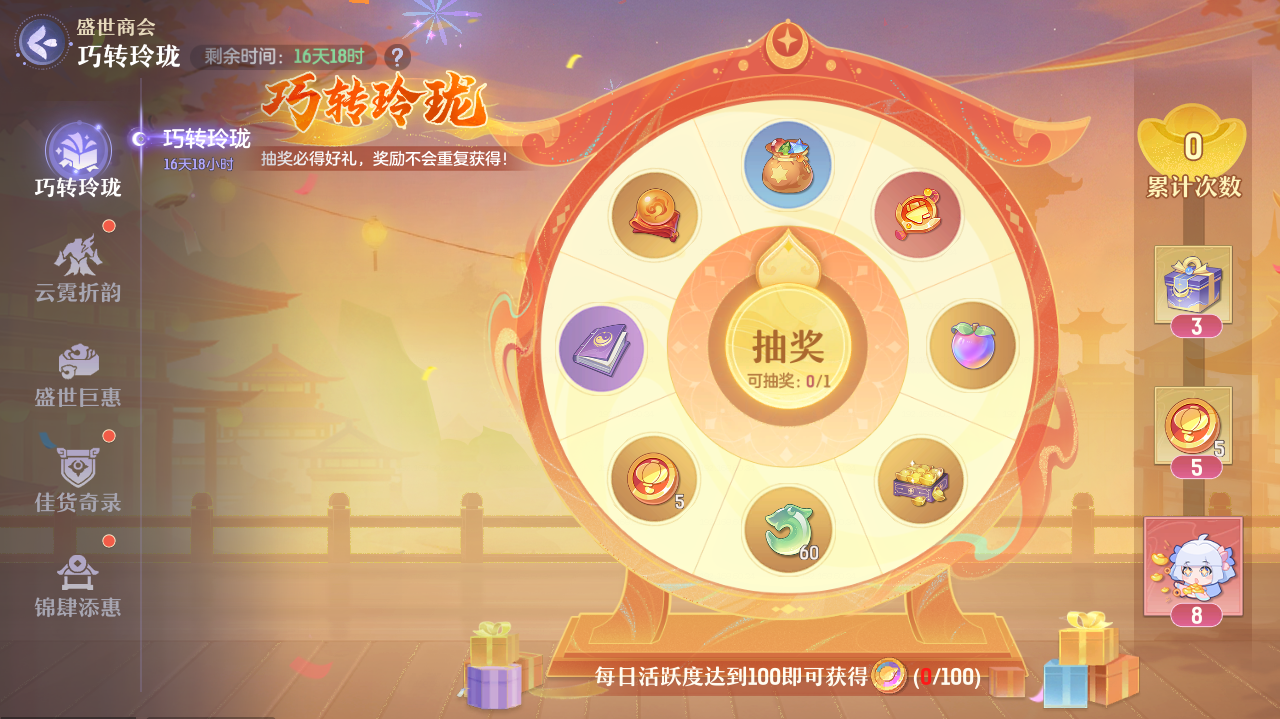活动期间,每天活跃度达到100即可参与转盘抽取好礼,转盘内奖励不会重复获得,参与达到一定次数还可以额外领取节点奖励!