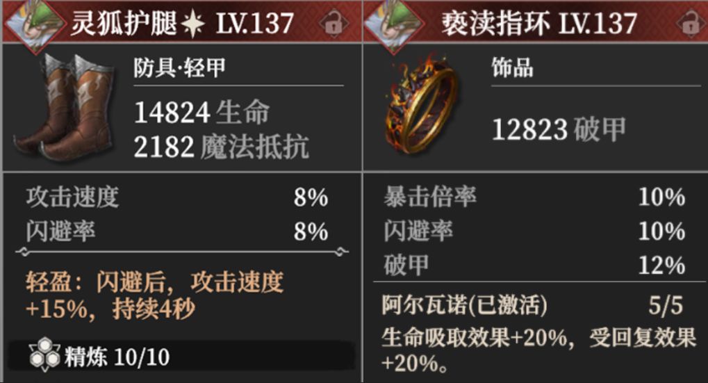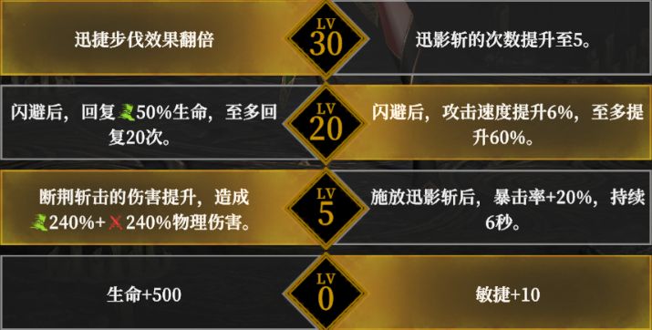 天赋方面,断荆者必须点出“迅捷步伐效果翻倍”的天赋,推荐加点如上;装备推荐阿尔瓦诺套装,防具穿戴“灵狐护腿”或者武器穿戴“黑暗嘉年华”,饰品最好也要带闪避率词条,最大化提高断荆者的闪避率。