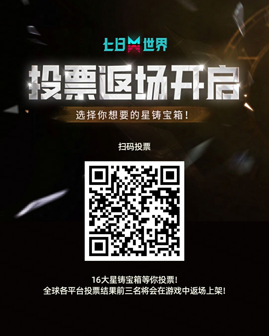 超越者们!星铸宝箱返场终于开启投票啦,下一期返场内容你来定,16大宝箱等你选择,速速扫码开投~