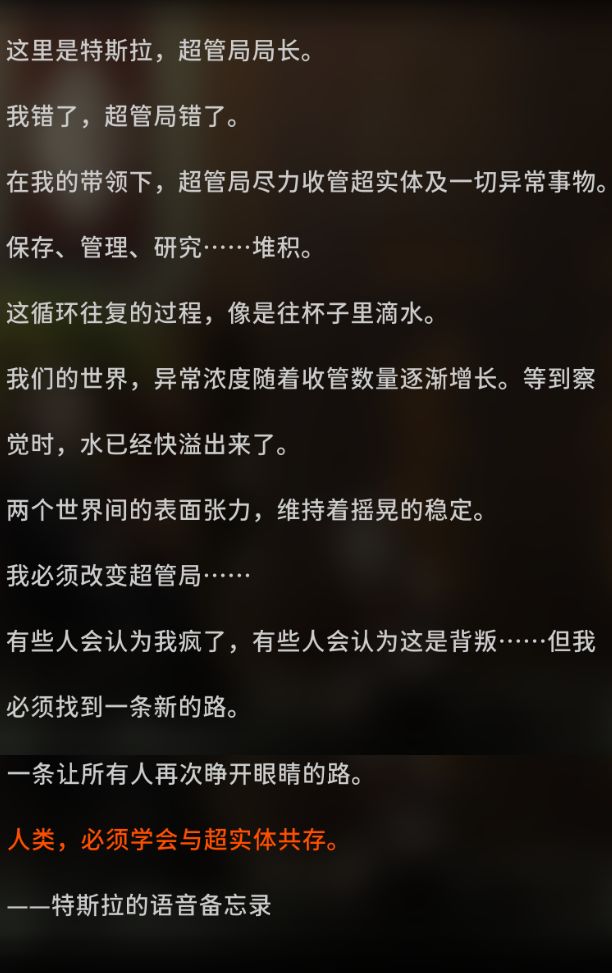组长加入超管局后,特斯拉将其提拔到“储君”的位置。特斯拉说过——超管局的收管方针是错的,人类应该和超实体共存,并希望组长能够改变这一切。