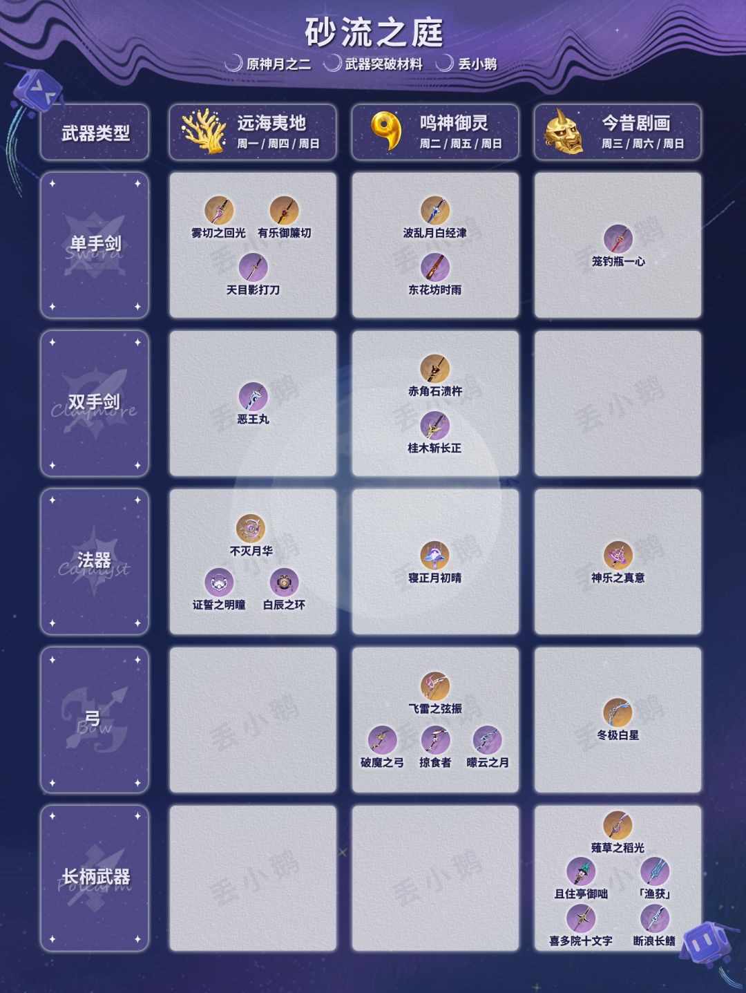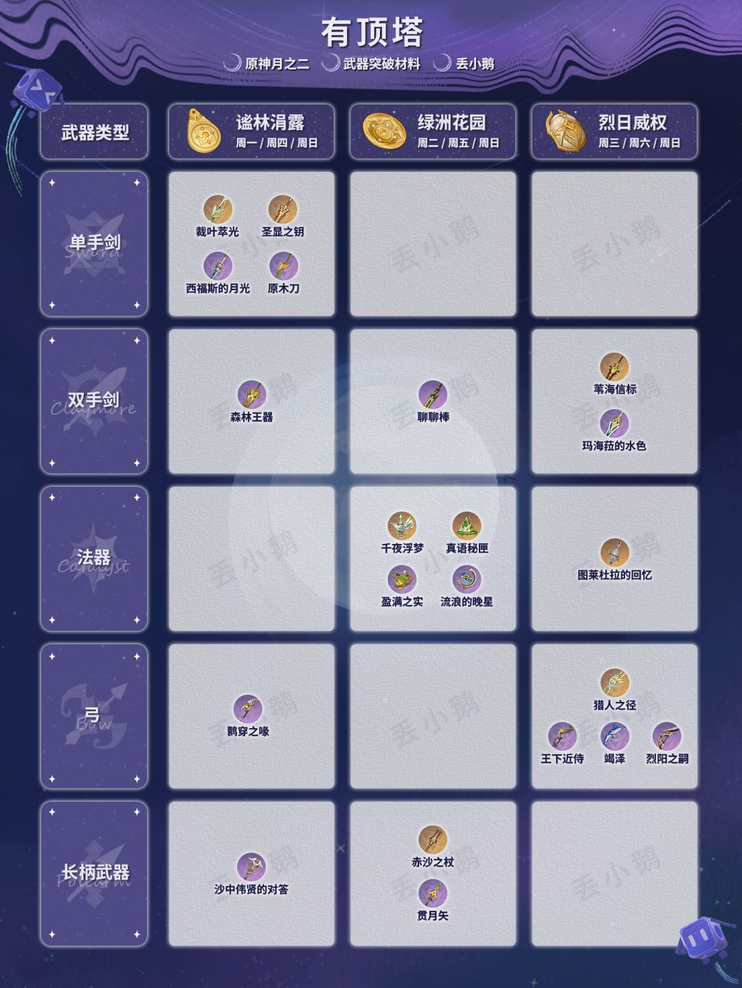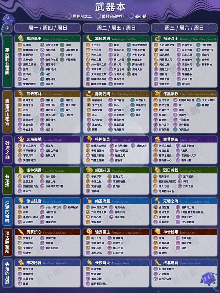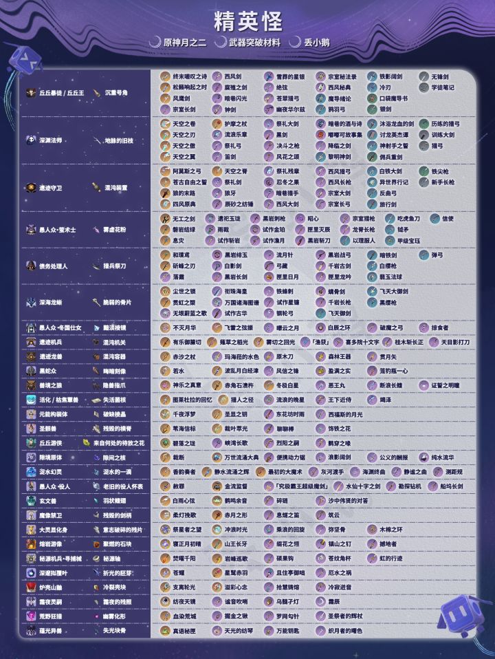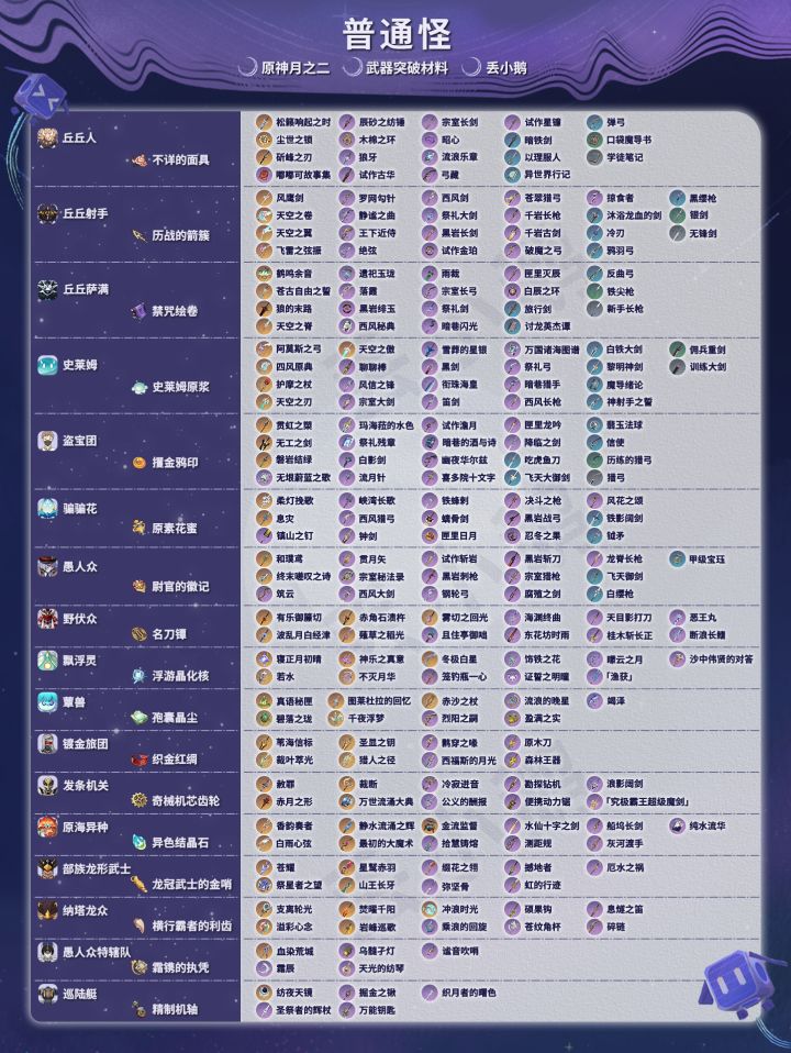 我是丢小鹅,为你带来【原神月之二】全武器突破材料。