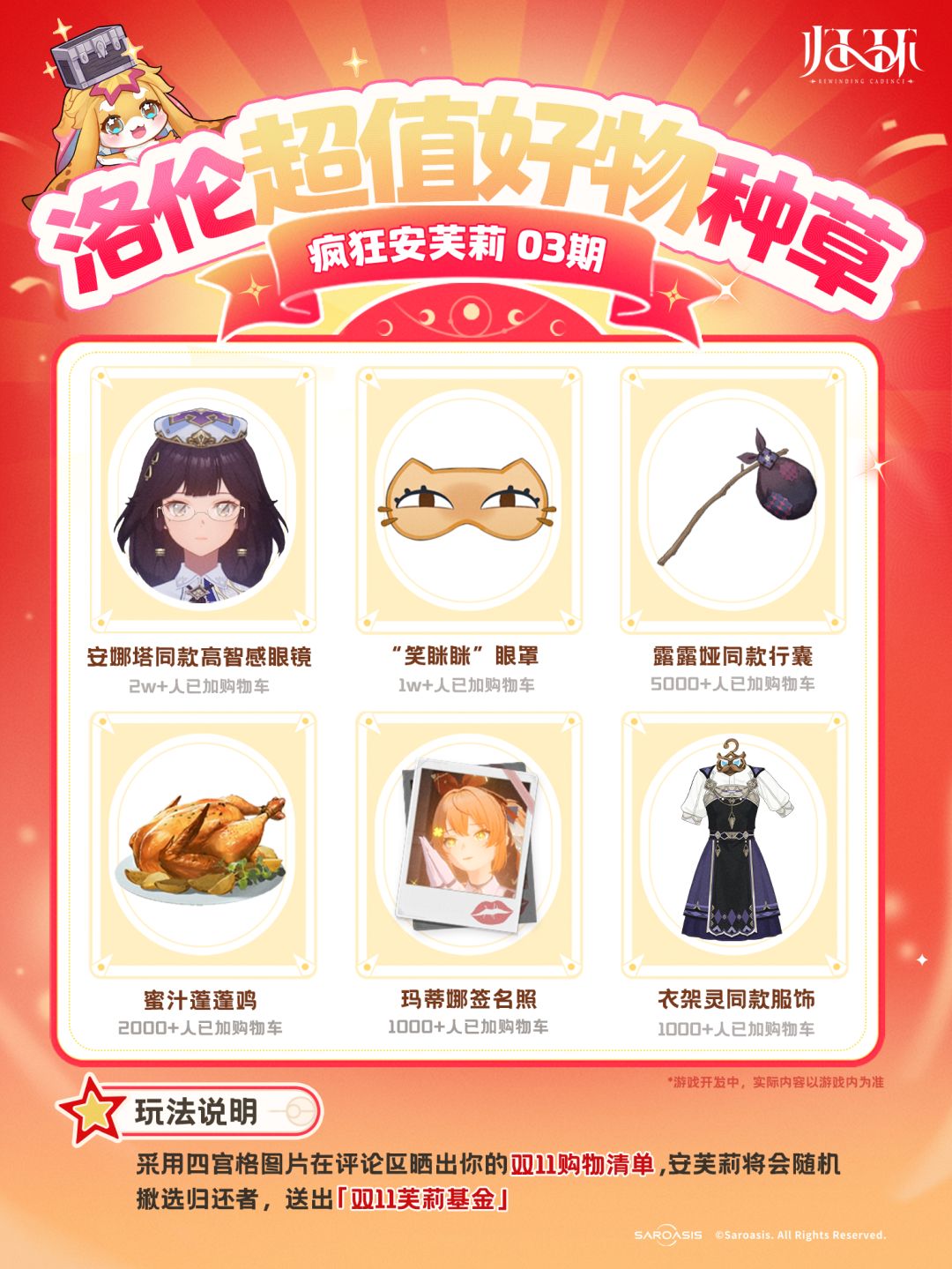 1️⃣在评论区采用四宫格图片晒出你的双11购物清单,安芙莉将会随机揪选归还者,送出「双11芙莉基金」*1,届时会艾特获奖归还者,请及时来领奖哦~![[表情_期待]](https://img-tc.tapimg.com/market/images/d26b9c5d2d83fec7f865b827ab8bf3ac.png)