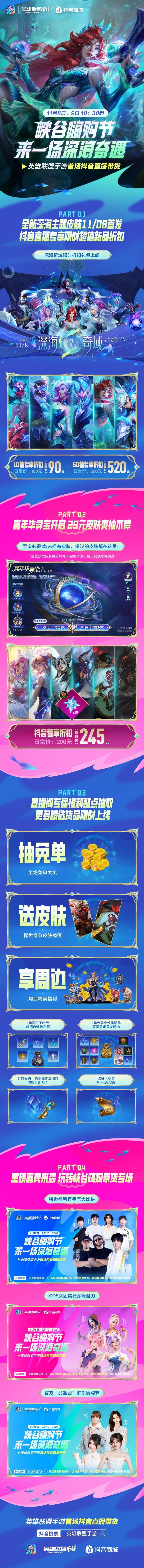 峡谷嗨购盛宴,深海奇遇来袭,《英雄联盟手游》首场抖音直播带货火热开启!11月8日(明日)-9日上午10:30起,召唤师们锁定直播间,来一场别开生面的深海奇遇~