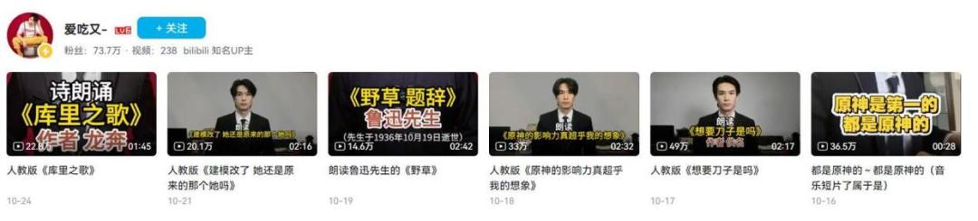 而之前的“爱吃又”也是朗读一些抽象文案,也有LOL的“我老爸得了mvp”和王者荣耀的“国服司空震”,但没什么游戏圈的强相关。主要是通过一本正经的朗读一些网路抽象文案,像“我是奶龙”,“叮咚鸡”这种也念,算对各类素材进行解构与重组,来达到一种反差带来的娱乐效果。不过看人吧,个人感觉是太过尴尬了,头皮发麻那种。他正经的朗诵视频属于没什么人看的。