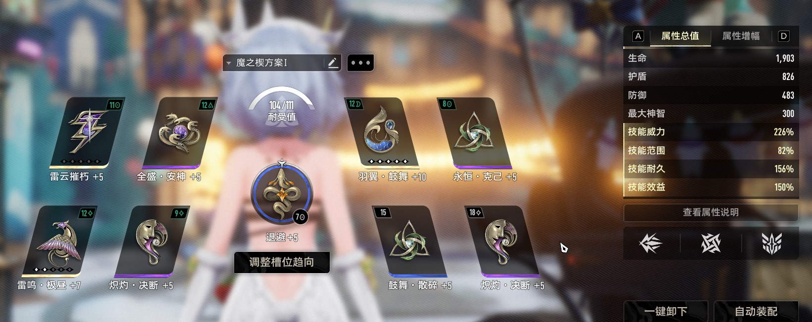 主打挂机,高贵的7000%倍率,放e还能增伤90%,进图开q等结束就行,50米固定范围电击,电荷和技能消耗吃持续,所以上减耗持续拉满,剩下的堆攻击威力,雷云不是特别适配但是做了不亏后面有雷角色也能用
