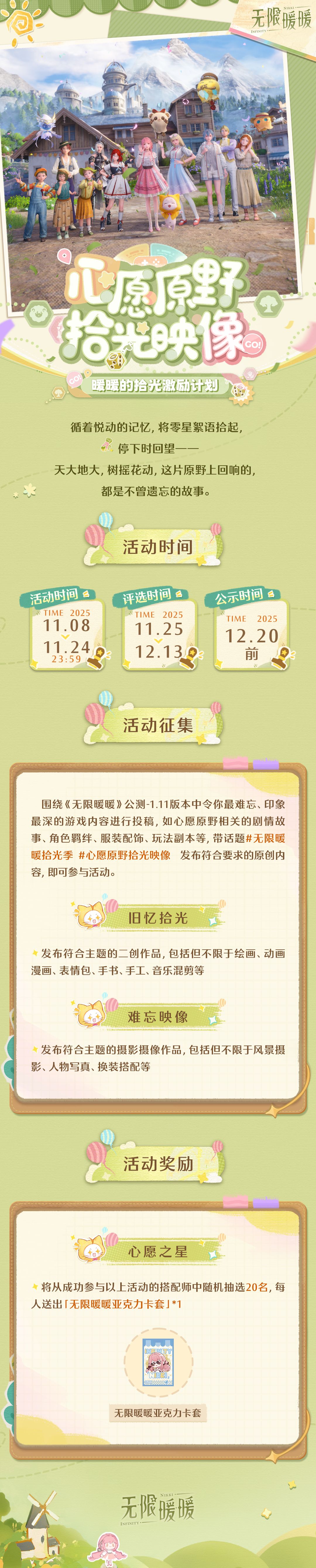2025年11月8日至11月24日期间,带话题#无限暖暖拾光季 #心愿原野拾光映像 发布符合要求的原创内容,即有机会获得精美周边!